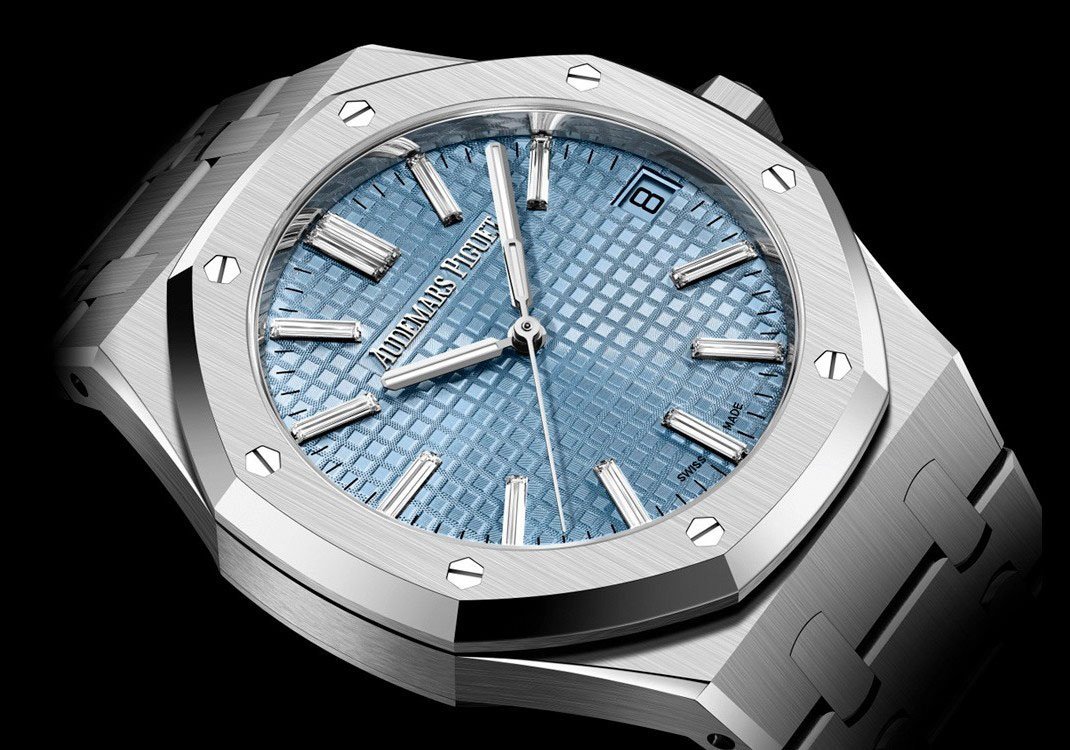 Light blue dial with “Grande Tapisserie” pattern. baguette-cut diamond hour-markers and white gold Royal Oak hands with luminescent coating.